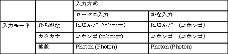 | ローマ字入力 | キーボードから入力した英字をローマ字で入力したと判断して、ひらがなまたはカタカナに変換します。 |