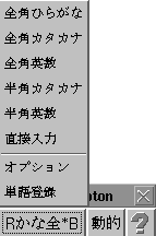 入力文字種と文字サイズは、日本語入力ツール・バーのモード・ステータス・ボタンを使って選択することもできます。ステータス・インジケータをクリックすると、次のようにオプションが表示されます。